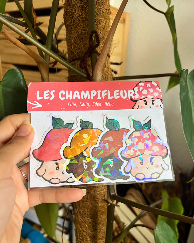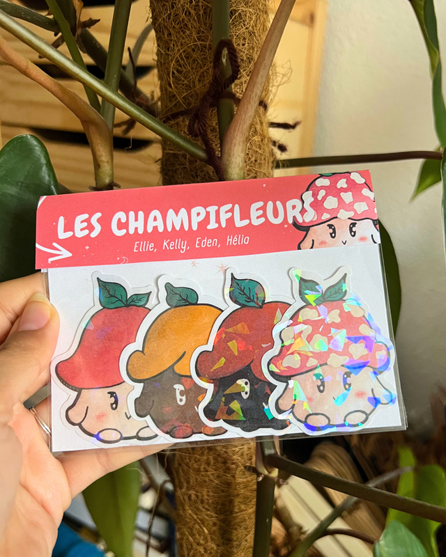 Kelly, la résiliente, Hélia, la lumineuse, Ellie, lae paisible et Eden, la florissante. Quatre champifleurs aux intentions et personnalités hautes en couleurs pour t'amener encore plus de merveilleux au quotidien.