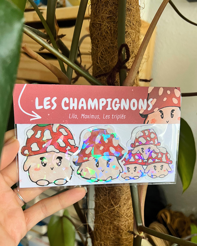 Petite Lila, Maximus, et les triplés ! Trois stickers champignons qui ajouterons une vibe cottagecore là où tu décideras de les coller ;)